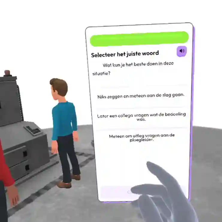 oor Speak And Spoke ontwikkelden we een scenario-gebaseerde VR-training waarin taal en interculturele communicatie samenkomen. Geen klassieke lessen of e-learning, maar een interactieve aanpak waarin deelnemers actief oefenen in herkenbare situaties op de werkvloer.